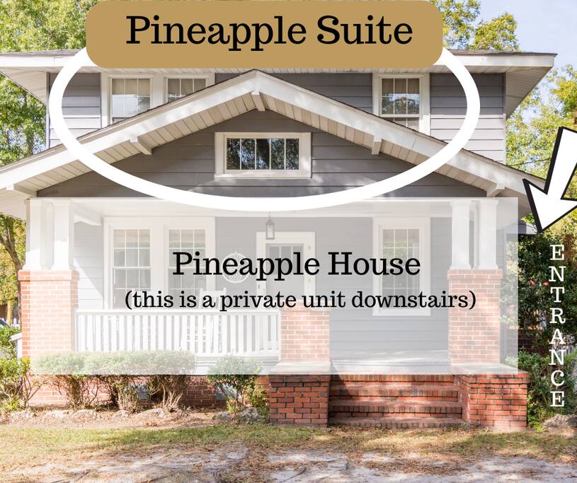Some of the best accommodations you'll find in Florence! This is a fully renovated, private 2nd floor apartment we call the "Pineapple Suite" perfect for professionals. This historic bungalow has 2 separate units, one downstairs and one upstairs. The downstairs "Pineapple House" includes the large backyard & front porch. You can check its availability on our other listing to reserve both separately. THIS LISTING IS FOR THE UPSTAIRS APARTMENT only. Here's what you can expect at the Pineapple Suite: LIVING ROOM -Roku TV -large leather sofa and leather chair -dining table with seating for 2 -ceiling fan - blackout curtains BEDROOM -king bed w/ linens provided -Roku TV -desk -dresser, lots of closet room -ceiling fan -room darkening curtains BATHROOM -shower -sink and sit-down vanity -toilet -towels and washcloths provided -full size washer and dryer KITCHEN -stainless fridge, oven/range, dishwasher, microwave, toaster -Keurig Duo (for K-cups or ground coffee) -pots/pans, dishes, & everything needed to make meals PARKING -There is a driveway that can park up to 2 cars right next to the entrance to the suite + street parking if needed. If someone is staying in the downstairs unit, please know you may see them in the driveway as well. CLIMATE CONTROL: central heat and air CHECK IN: Private entrance is through a side door on the home. Guests may check in at their convenience anytime after 3pm with a personalized code. ***We do NOT rent to those under 25. While there is soundproofing between the upstairs and downstairs, please don't be surprised if you occasionally hear downstairs guests or see them on the porch, the back yard, or the driveway. If this would cause you to give us less than 5 stars in your review for something we've disclosed, we might not be the best fit for your stay. We seek to attract quiet professionals to both units. MONTHLY RATES: If you're interested in renting the Pineapple Suite for over 1 month, we have a long term rental agreement and required monthly cleanings. WHAT'S NEARBY FMU Performing Arts Center 3 min Restaurants 3 min Groceries 4 min McLeod Health Center 5 min Florence Airport 8 min Florence Convention Center 9 min Francis Marion University 10 min MUSC Health Center 10 min