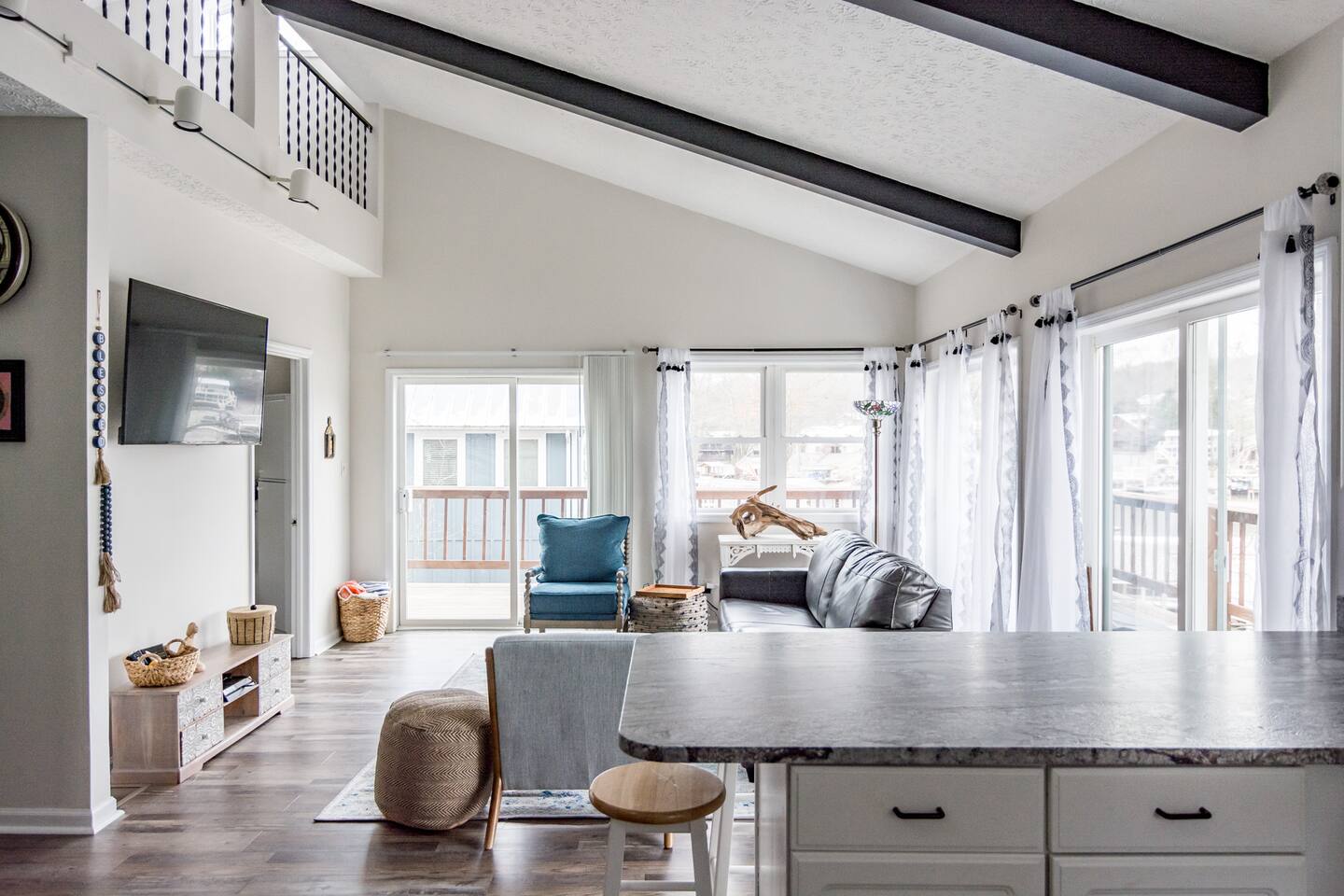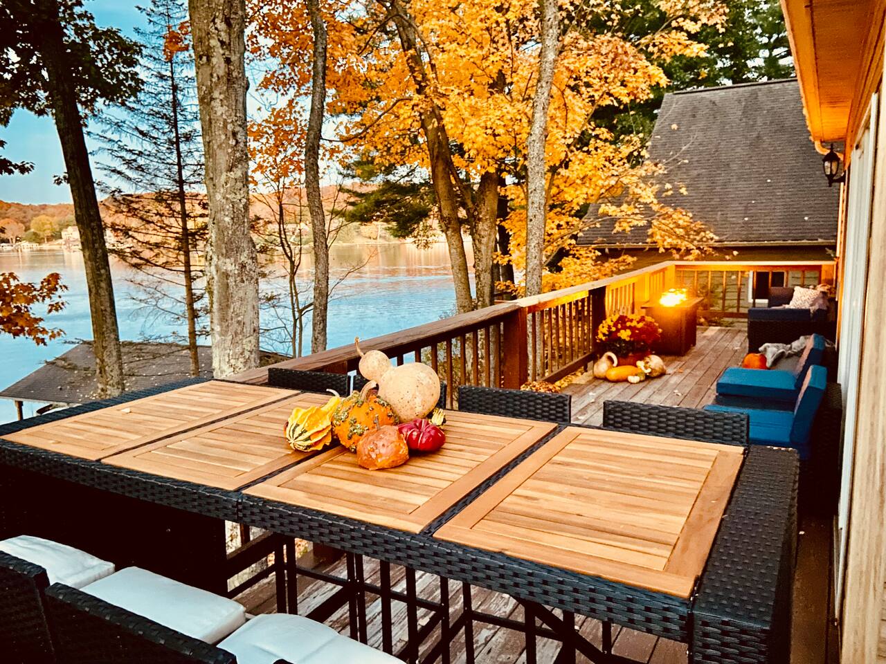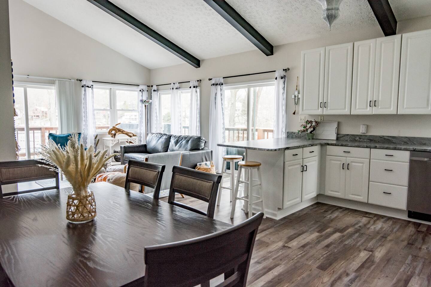 Relaxing waterfront home on Apple Valley Lake! • Private lake with dock for lounging, swimming, & fishing • Fire pit, gas grill, spacious upper deck with dining + lounging • Heated game room: ping pong, electronic darts, yoga mats, Playstation 4 • 2 in-suite bathrooms + spiral staircase to open loft bedroom • 5 min to restaurants & Apple Valley Golf Course (PGA golf) • 10-20 min: Kenyon College, Kokosing Gap Trail, Mohican State Park • 1 hr to Amish Country & Columbus!